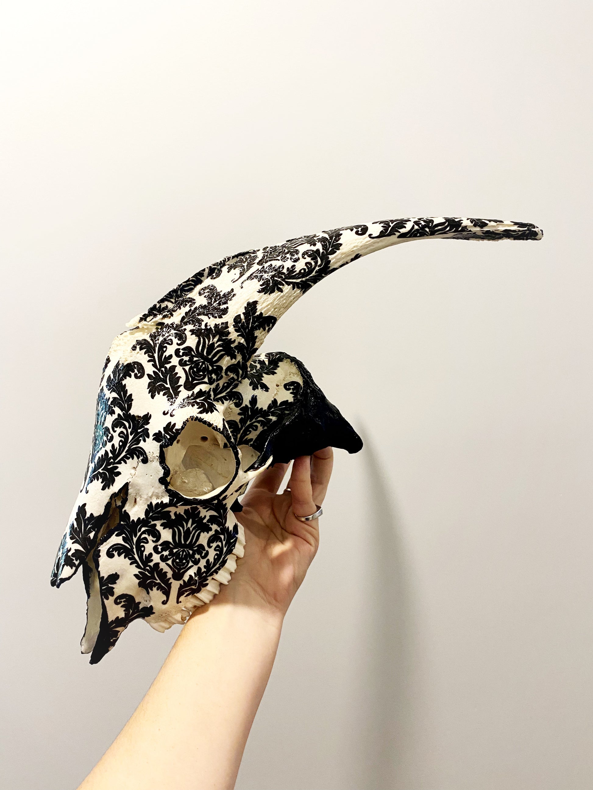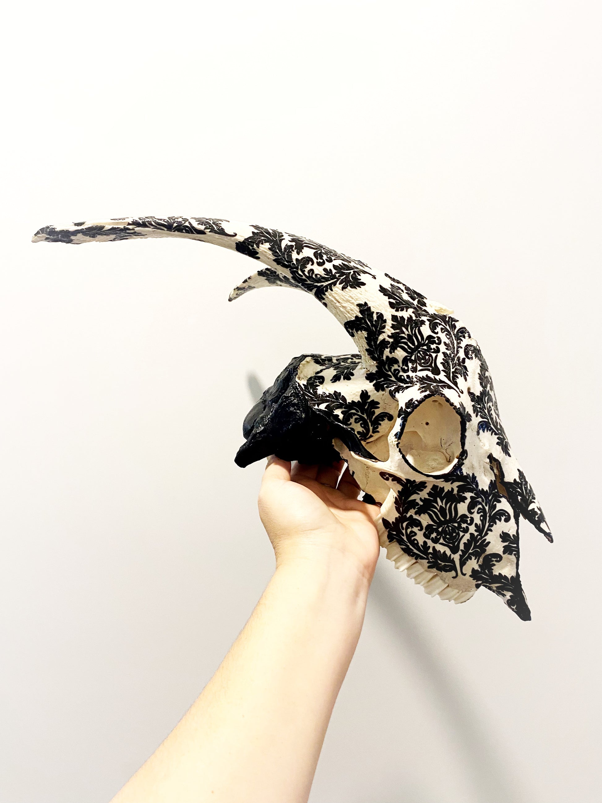 Sustainably sourced goat skull embellished with baroque art déco patterns and black accents.