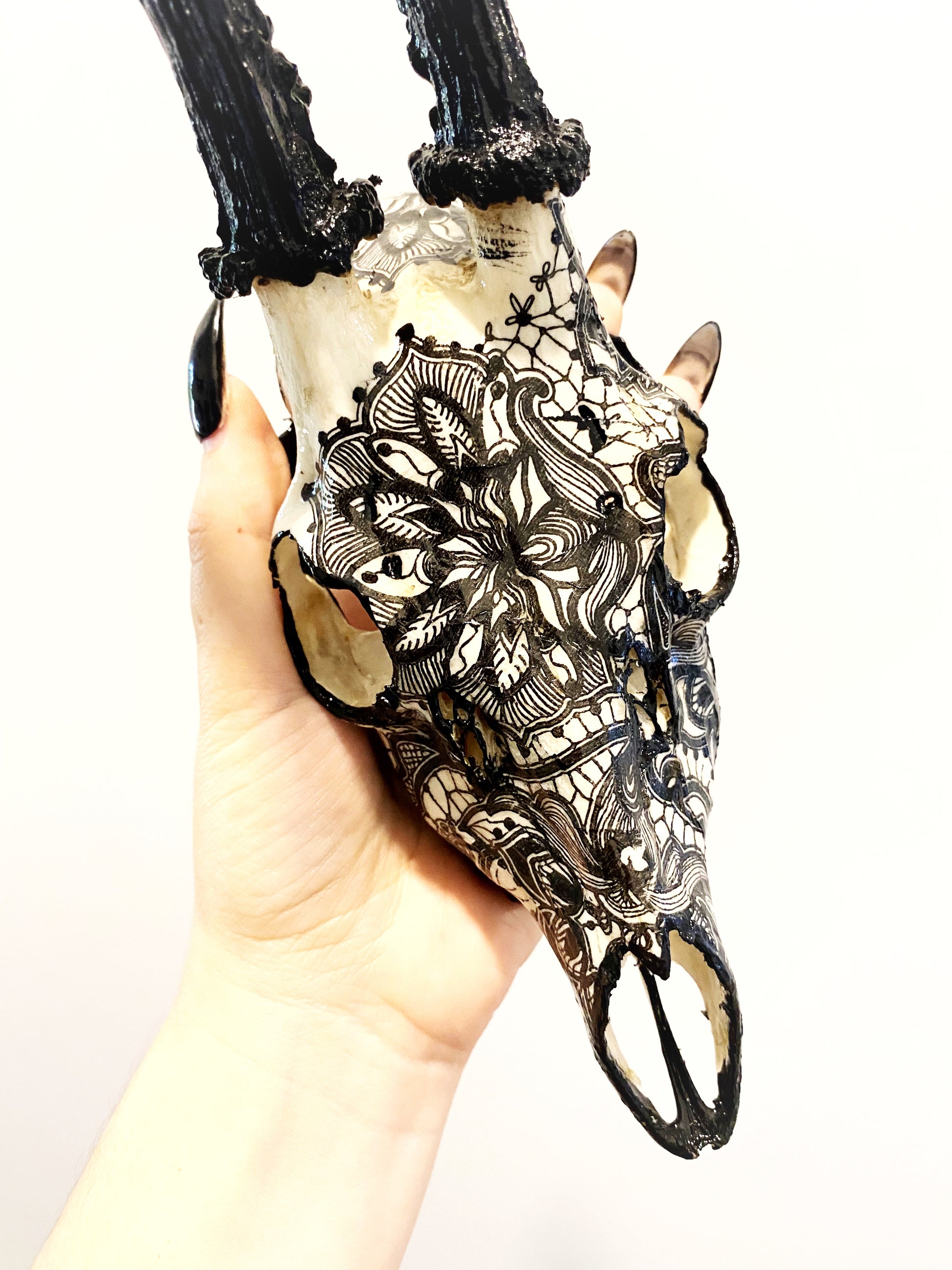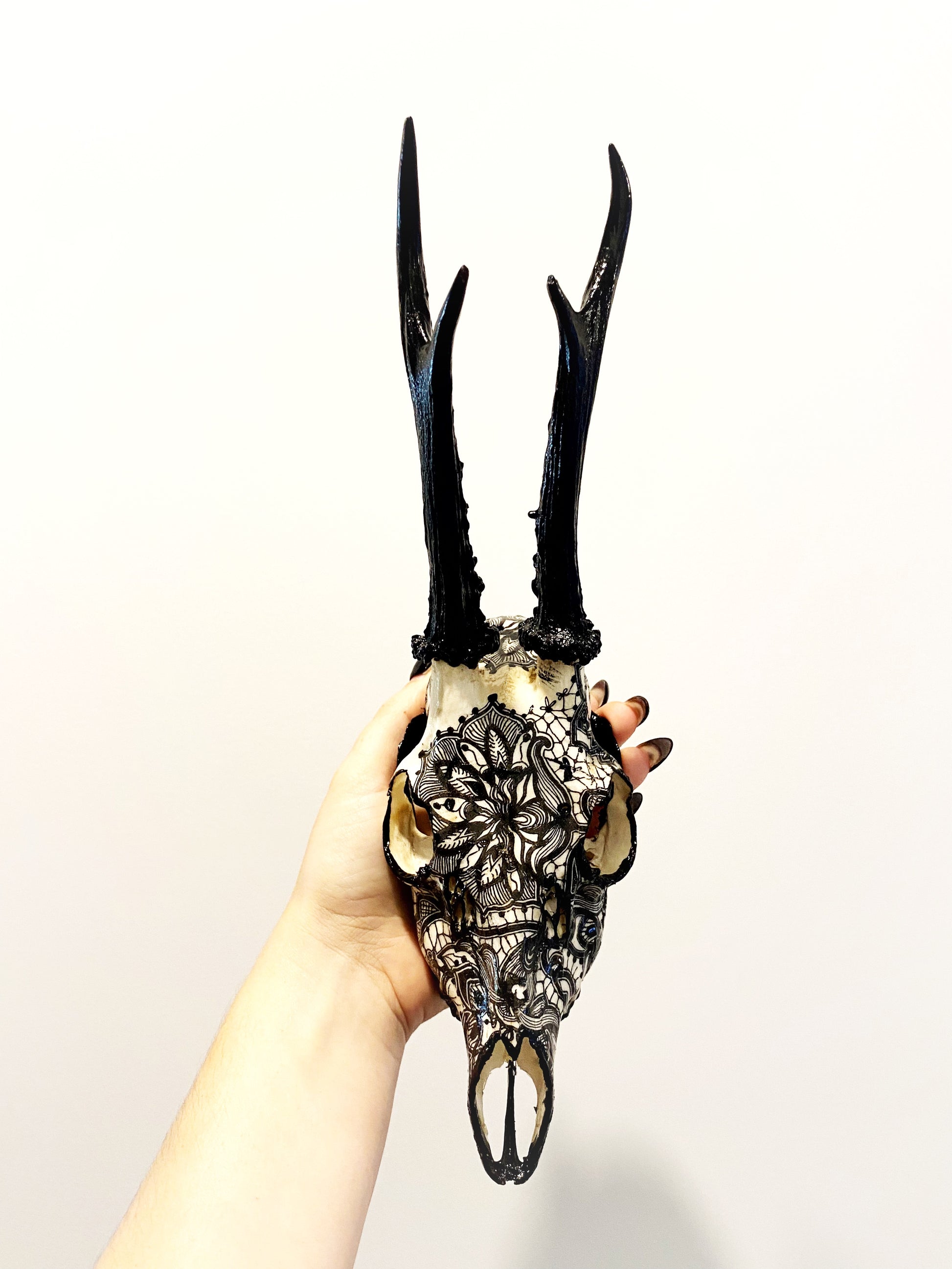 Sustainably sourced roe deer skull embellished with black lace and black accents.