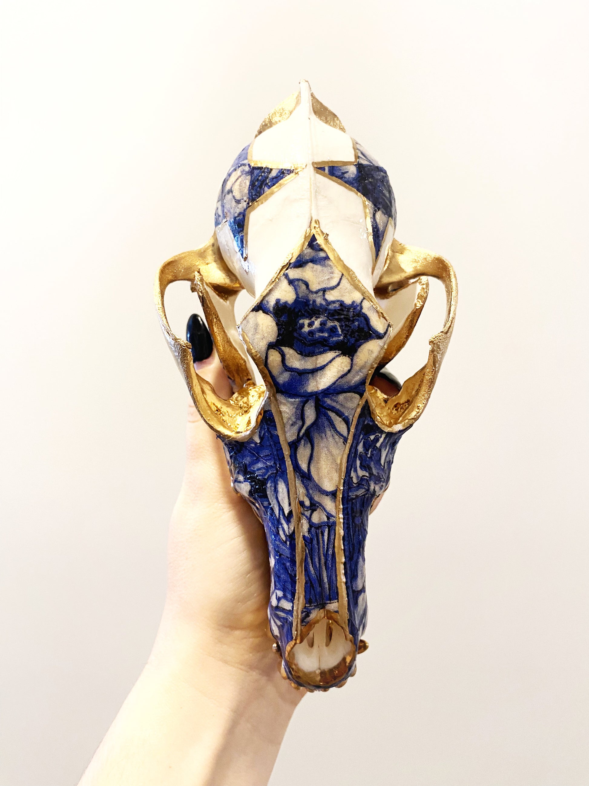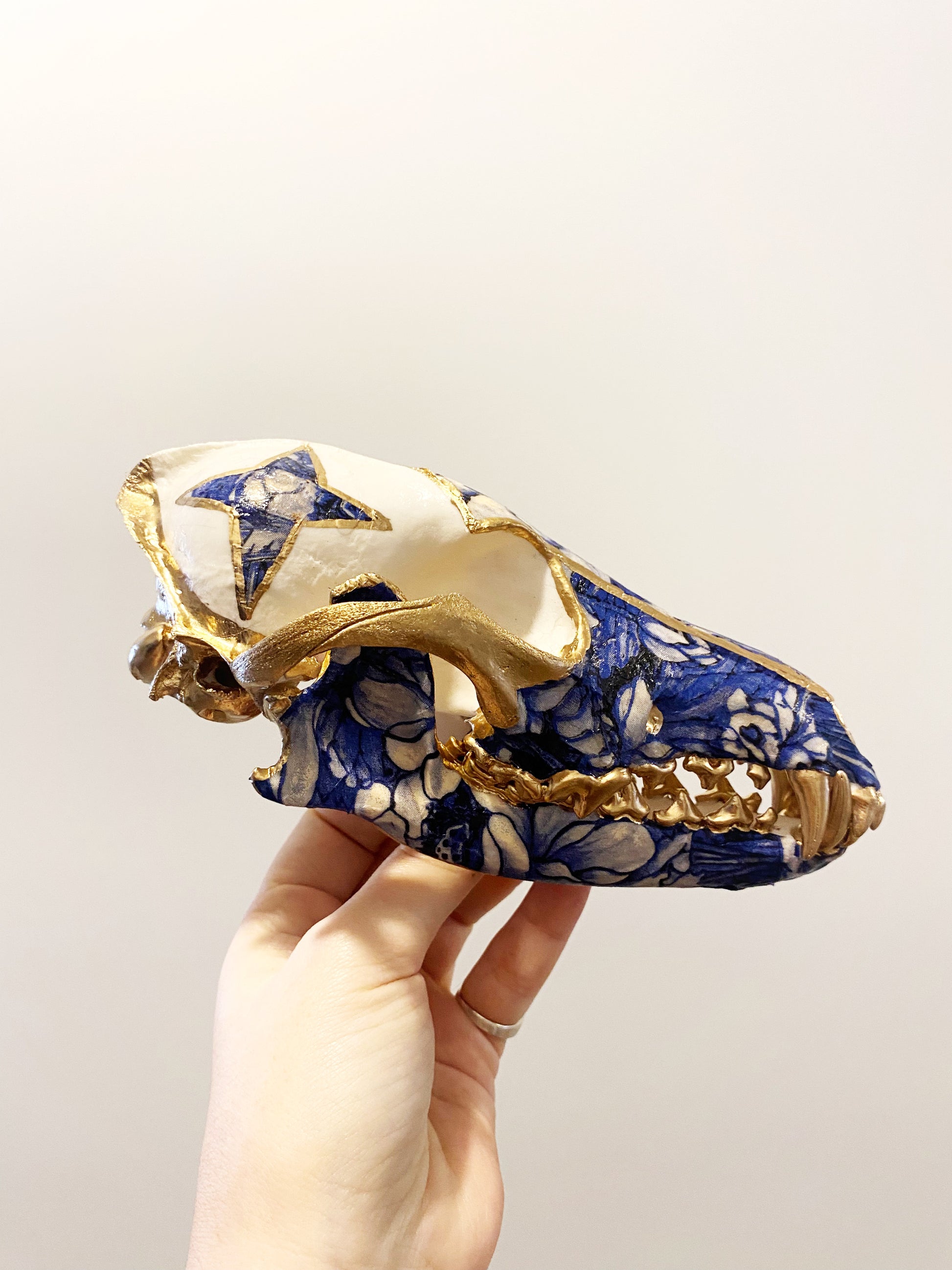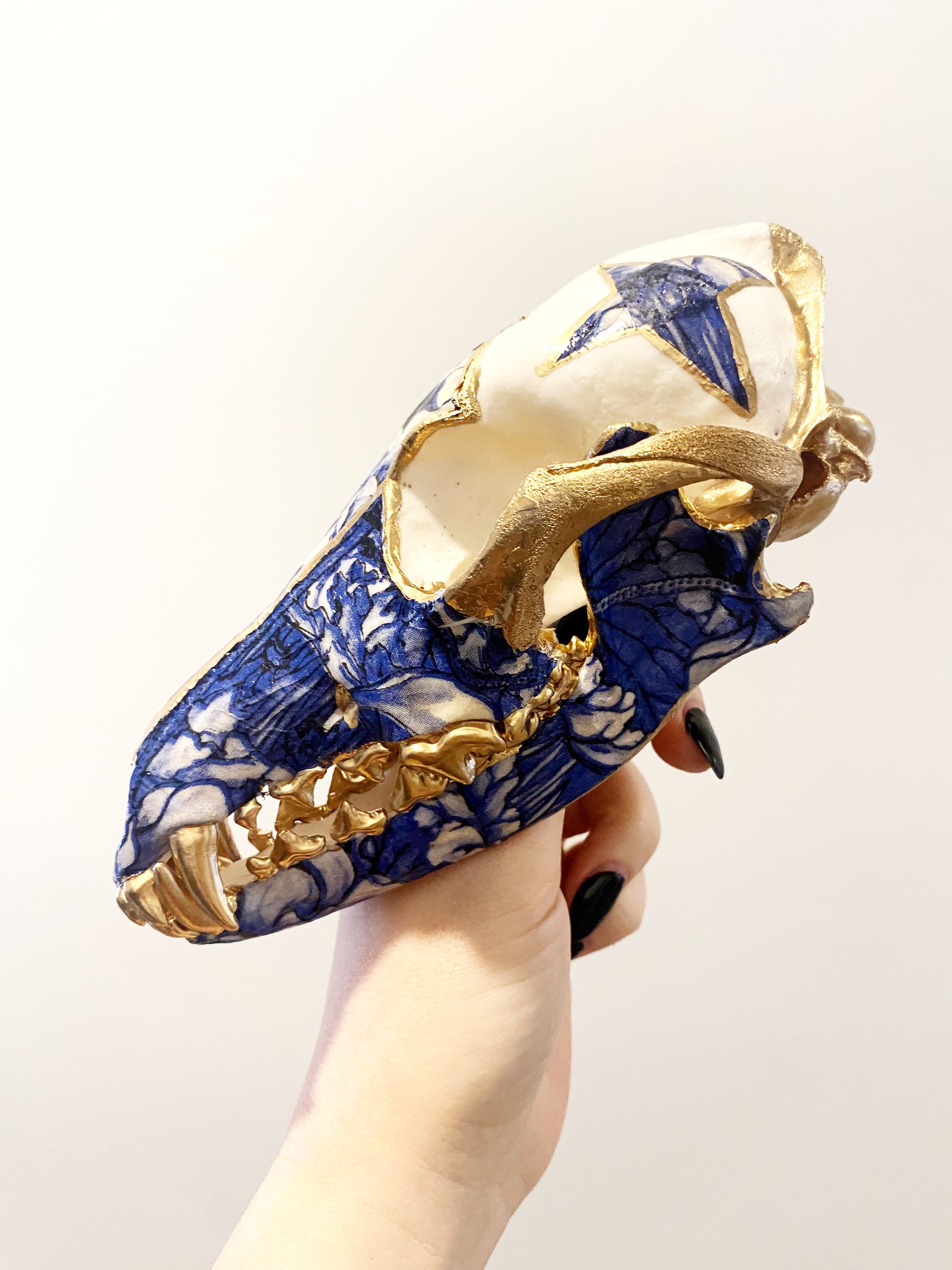 Sustainably sourced coyote skull embellished with a blue porcelain pattern and 22k gold.