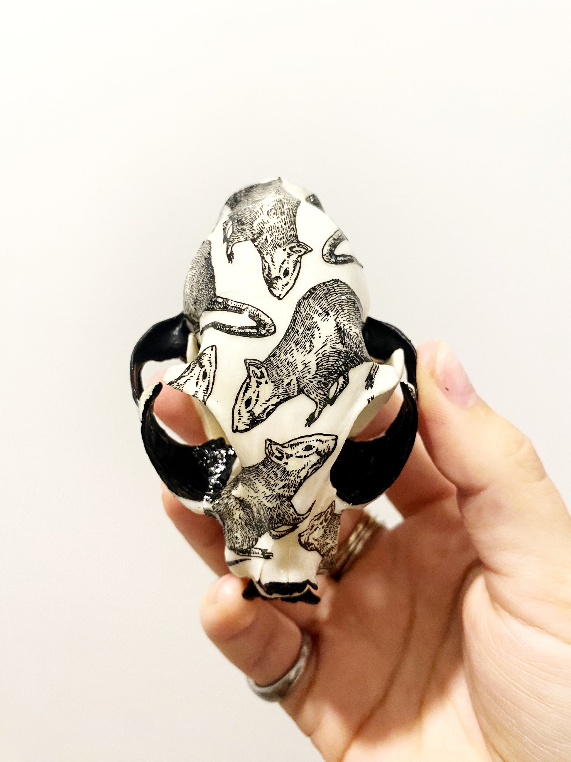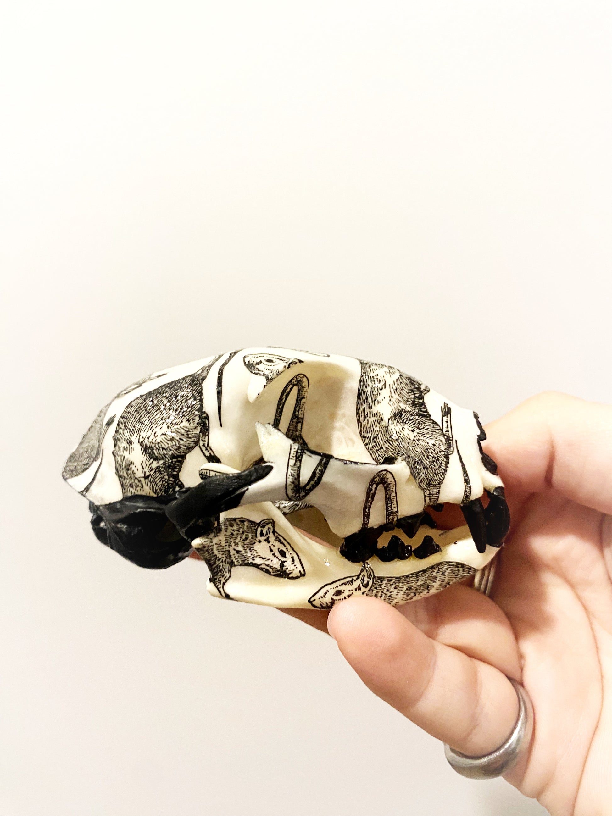 Sustainably sourced cat skull embellished with black rats and black accents.
