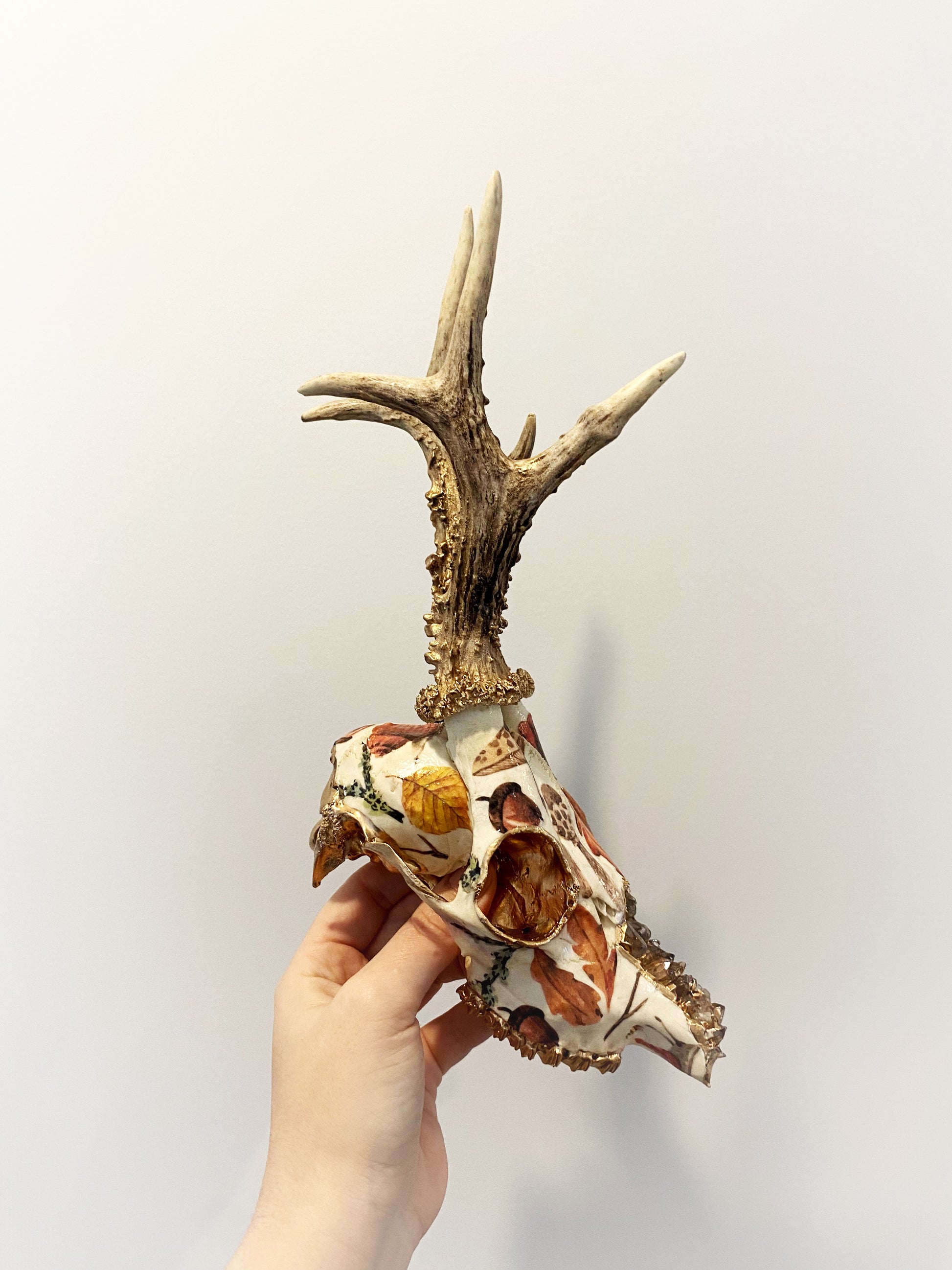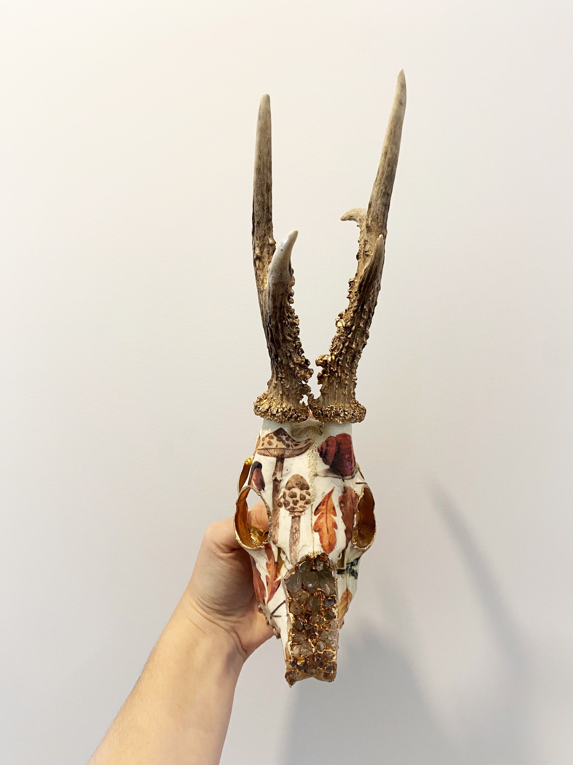 Sustainably sourced roe deer skull embellished with a beautiful bunch of snails and foliage, quartz and 22k gold.