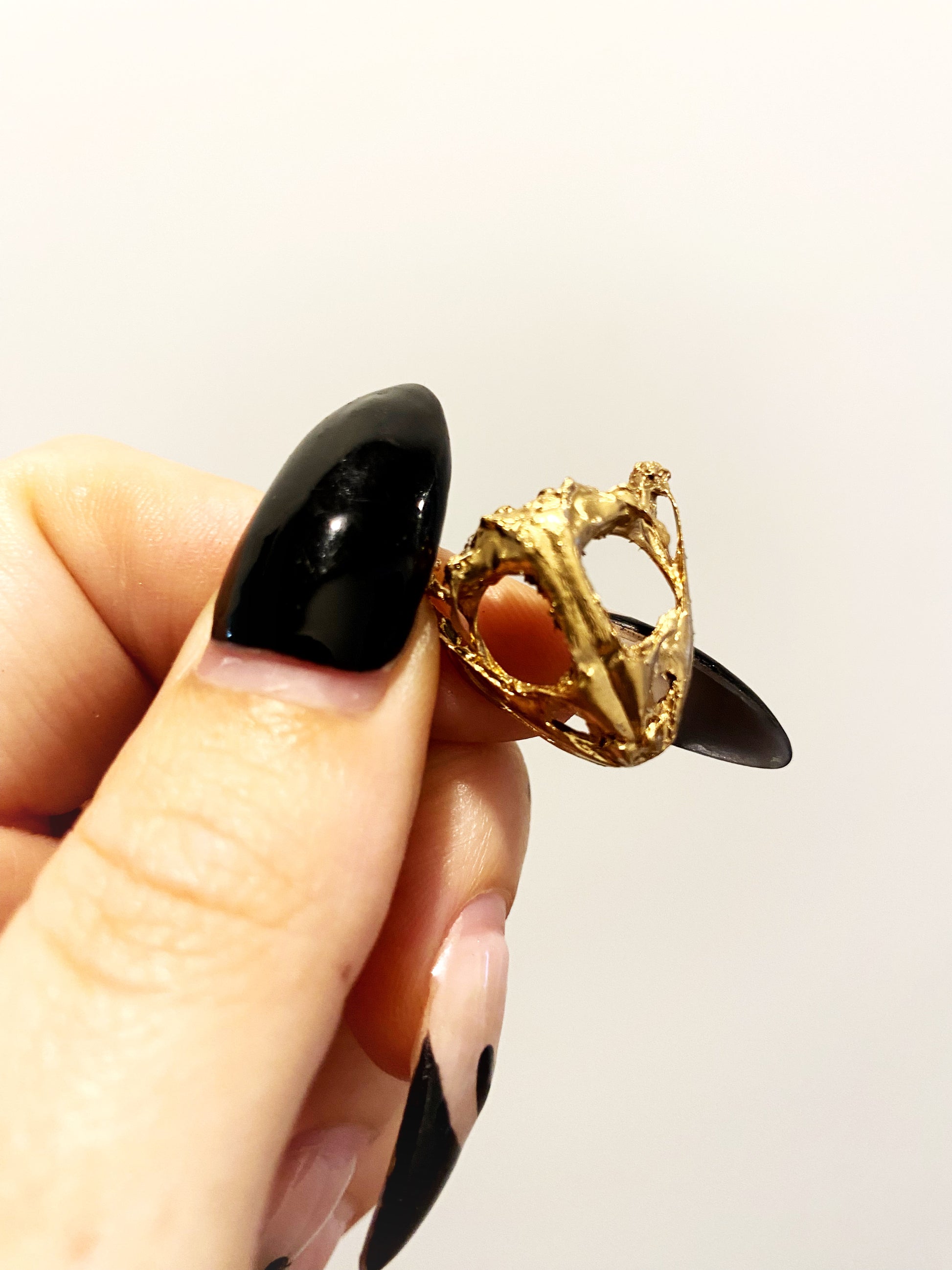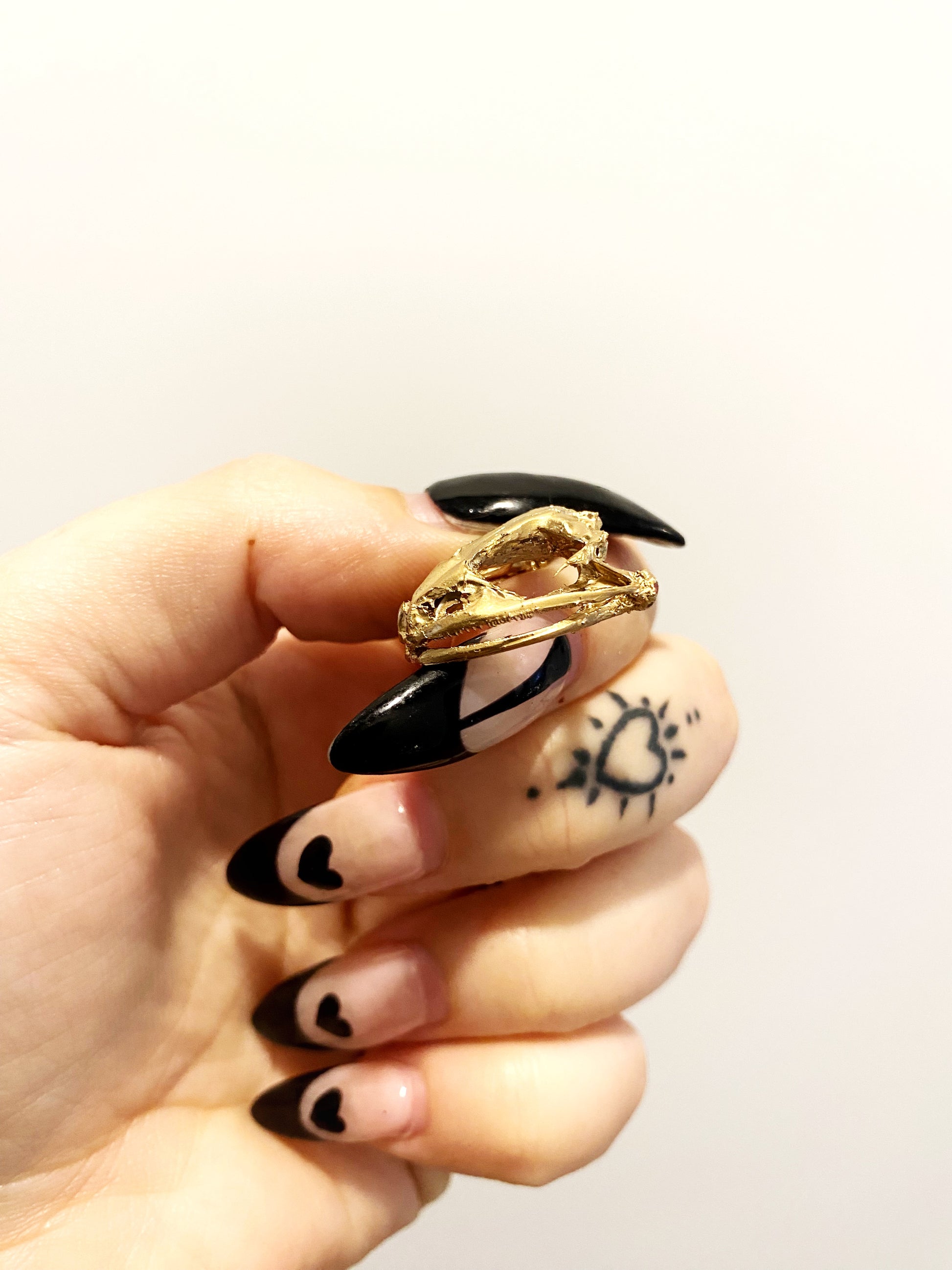 Sustainably sourced frog skull embellished with 22k gold accents.
