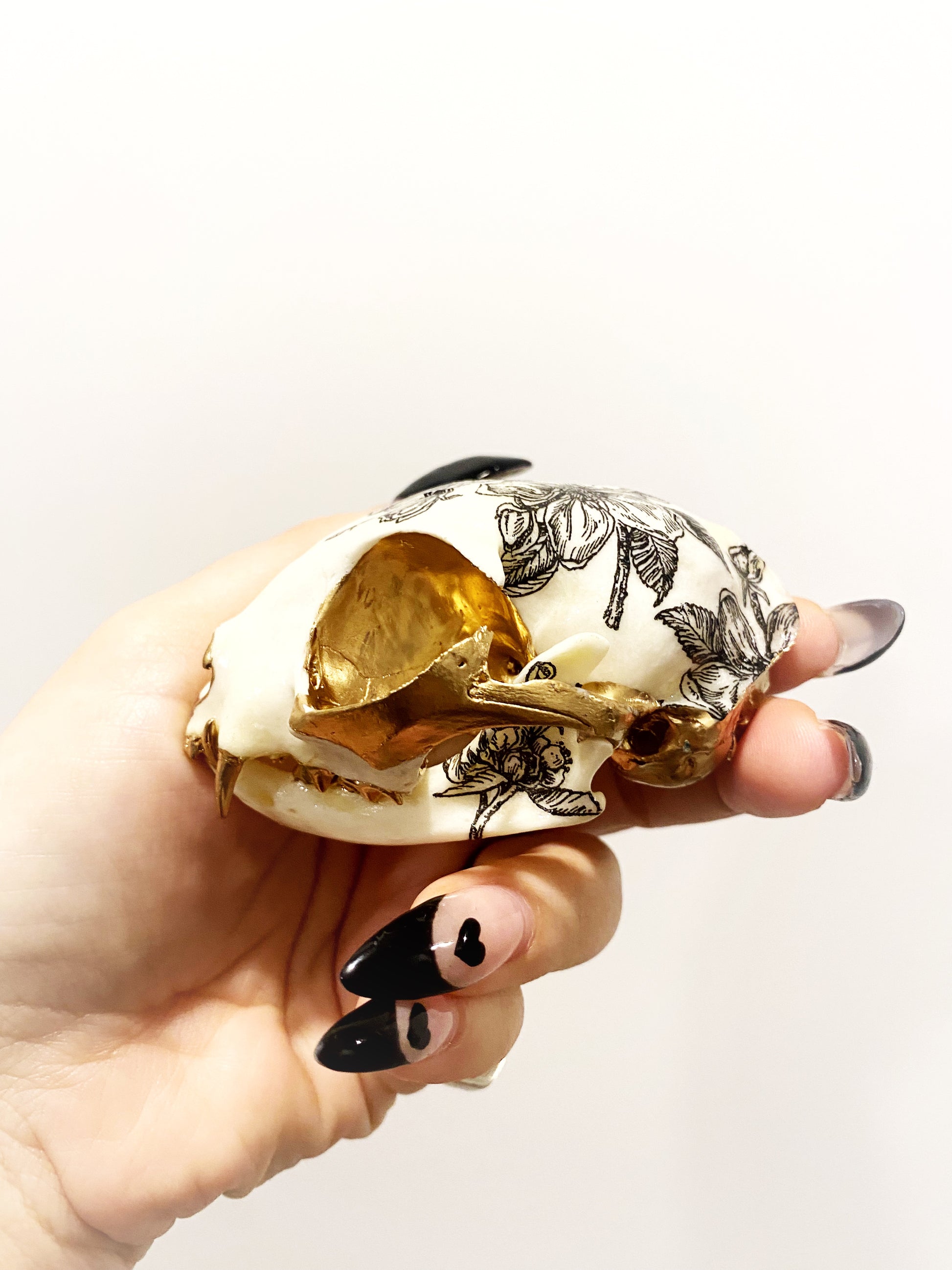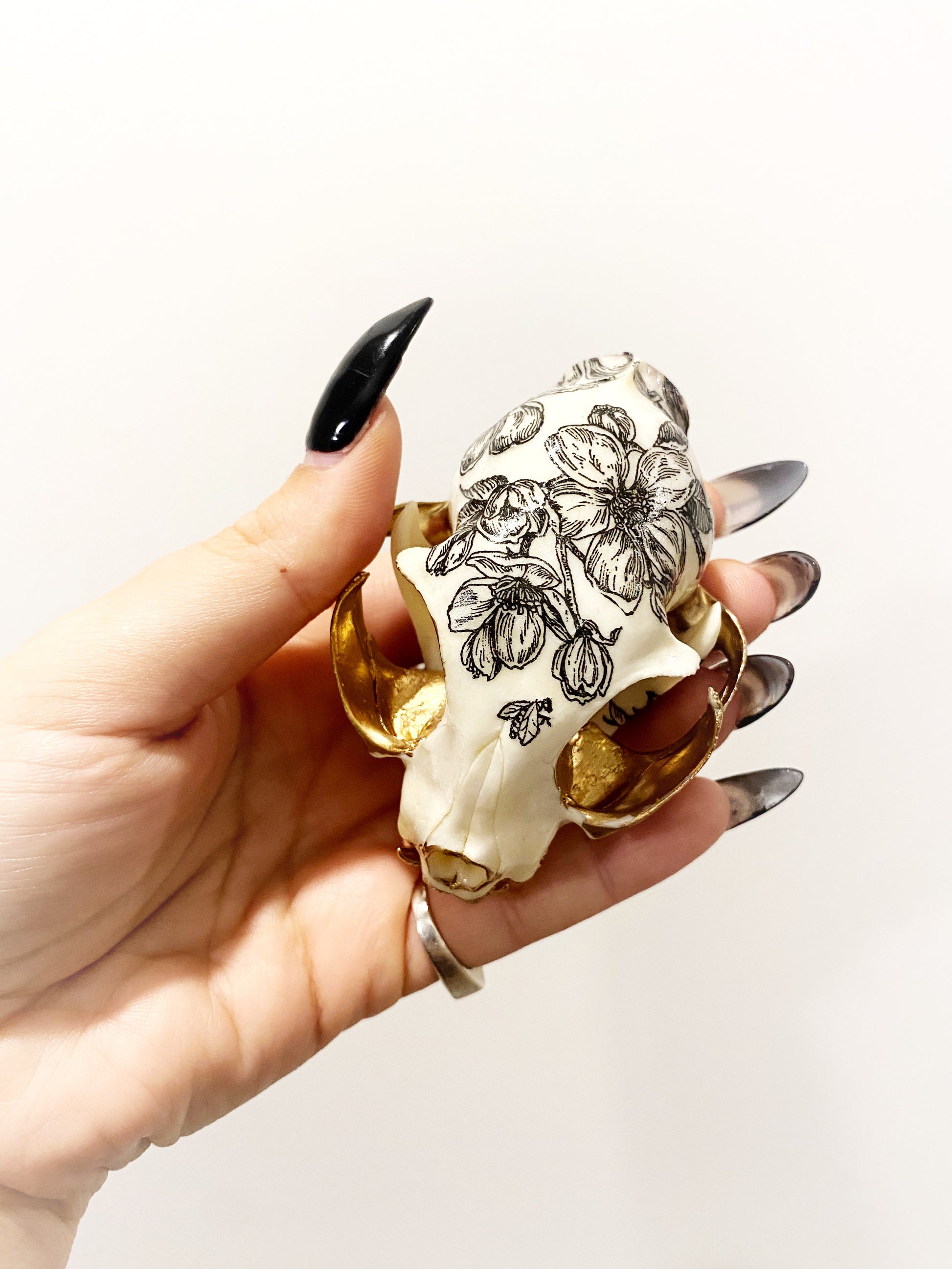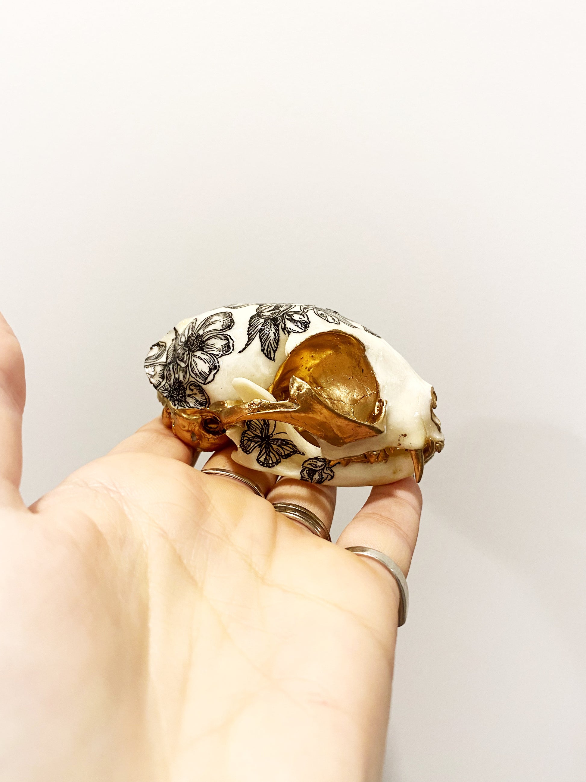 Sustainably sourced cat skull embellished with black florals and 22k gold.