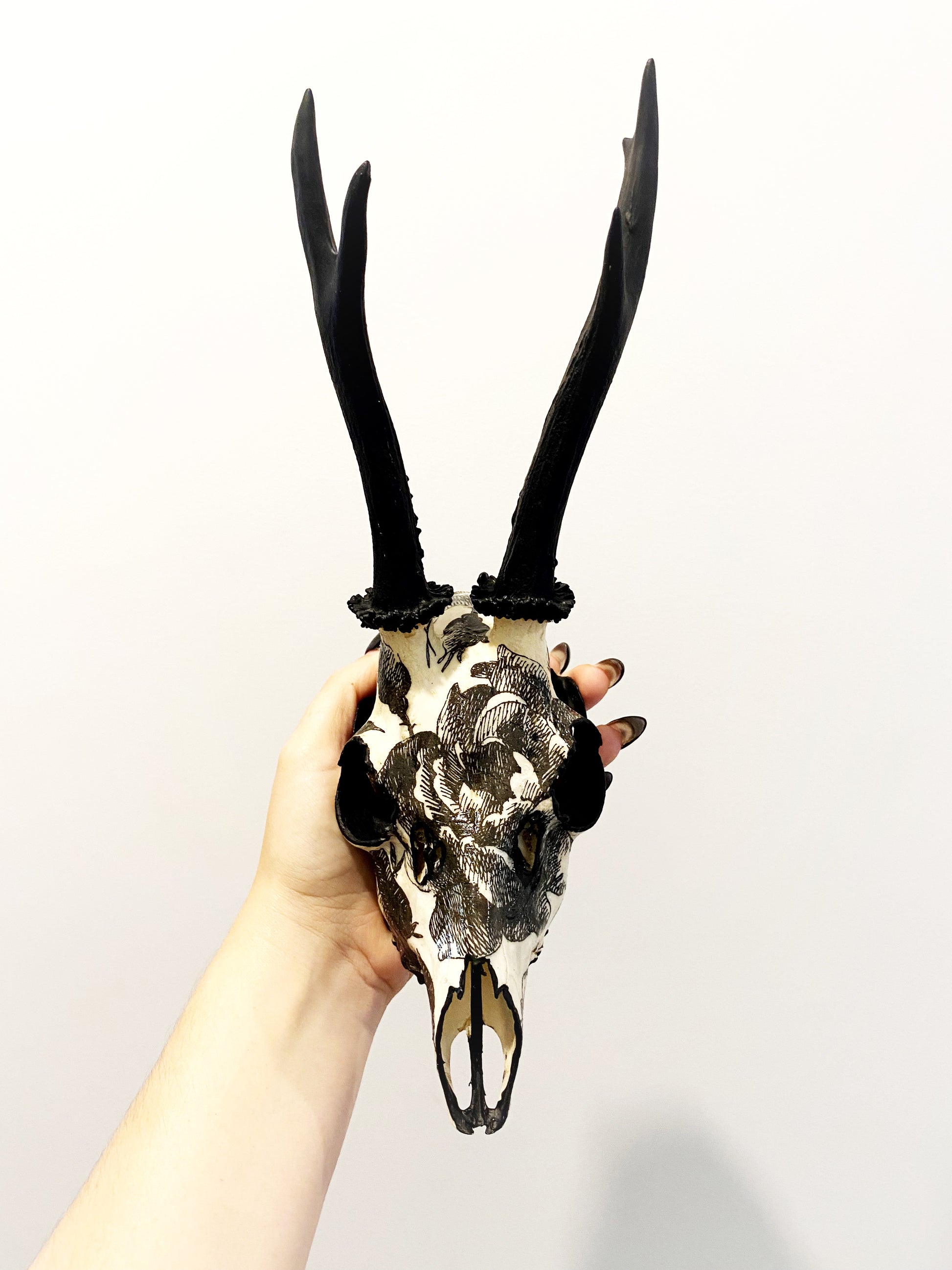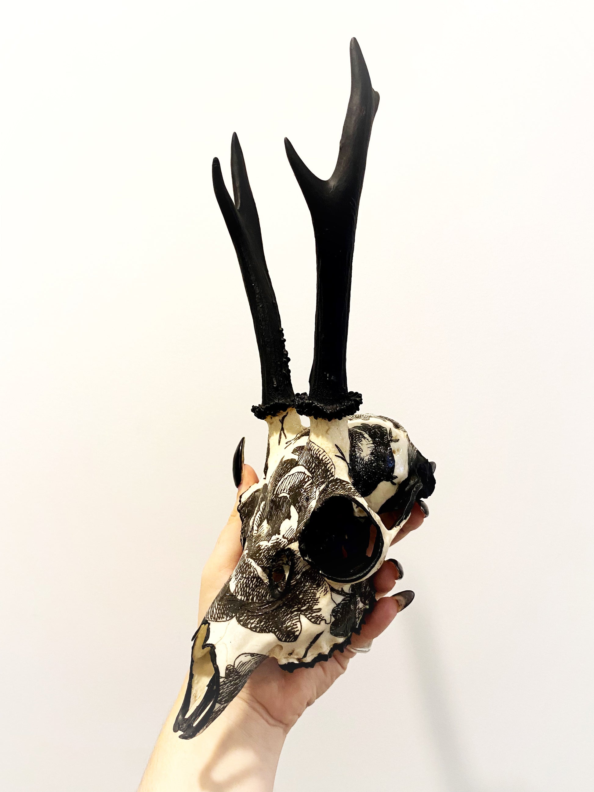 Sustainably sourced roe deer skull embellished with black roses and black accents.